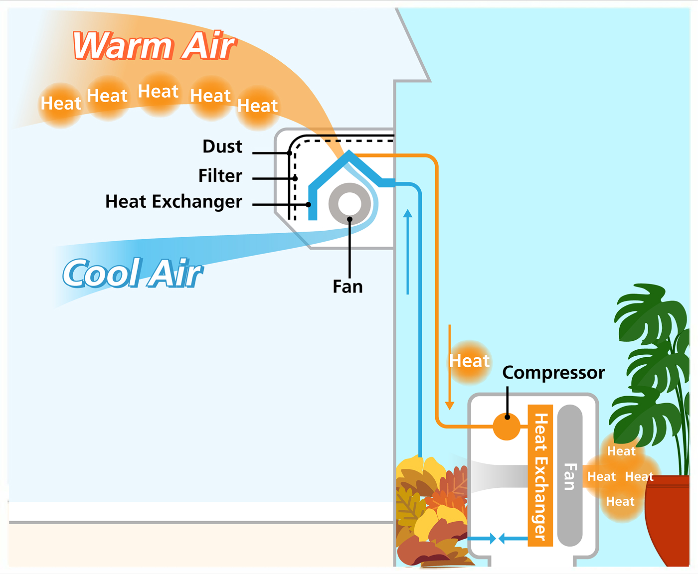 As previously mentioned in the misleading energy-saving tips, some people cover their outdoor units to protect the units from direct sunlight. However, when an obstruction blocks the air passage of the air intake or exhaust vents, heat is prevented from dissipating efficiently. Keeping the area around the outdoor unit neat and tidy by removing any objects nearby will help prevent unnecessary consumption of electricity.
