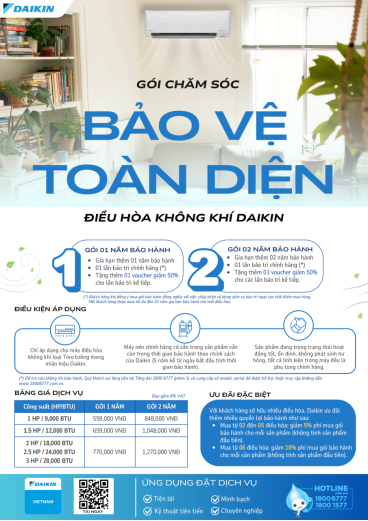 Bảo Hành Mở Rộng là minh chứng cho triết lý kinh doanh "Giá trị hôm nay, An tâm mai sau" của Daikin. Để được tư vấn chi tiết về chính sách, bảng giá và quy trình đăng ký, Quý khách hàng vui lòng liên hệ qua các kênh chính thức.