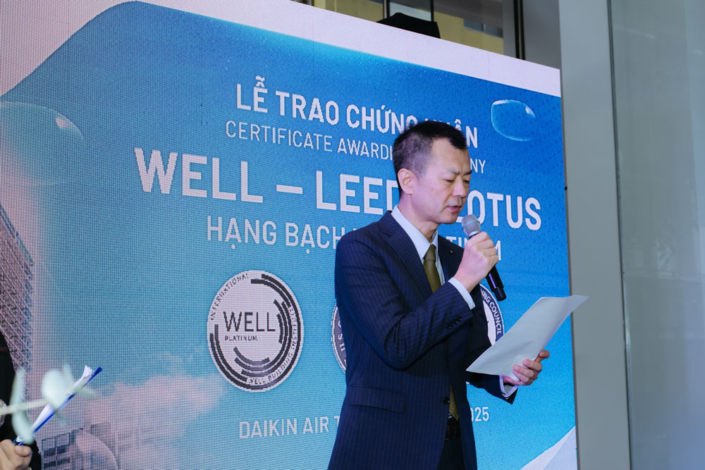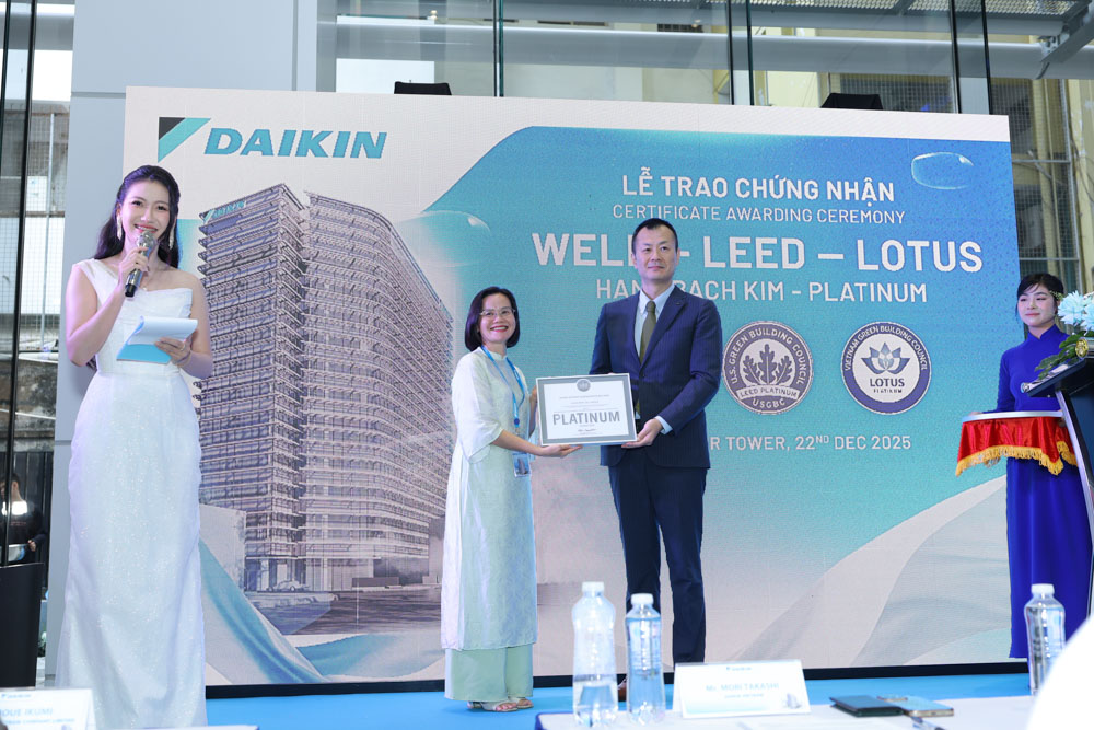 Trong không khí trang trọng và hào hứng, Daikin Vietnam đã tổ chức lễ trao chứng nhận công trình xanh quốc tế cho Daikin Air Tower – trụ sở chính của Daikin tại Việt Nam – vào sáng ngày 22/12/2025. Đây là tòa nhà đầu tiên trên thế giới đạt đồng thời ba chứng nhận công trình xanh quốc tế WELL, LEED và LOTUS ở hạng Bạch kim, đánh dấu cột mốc quan trọng trong hành trình phát triển bền vững của Daikin tại Việt Nam.