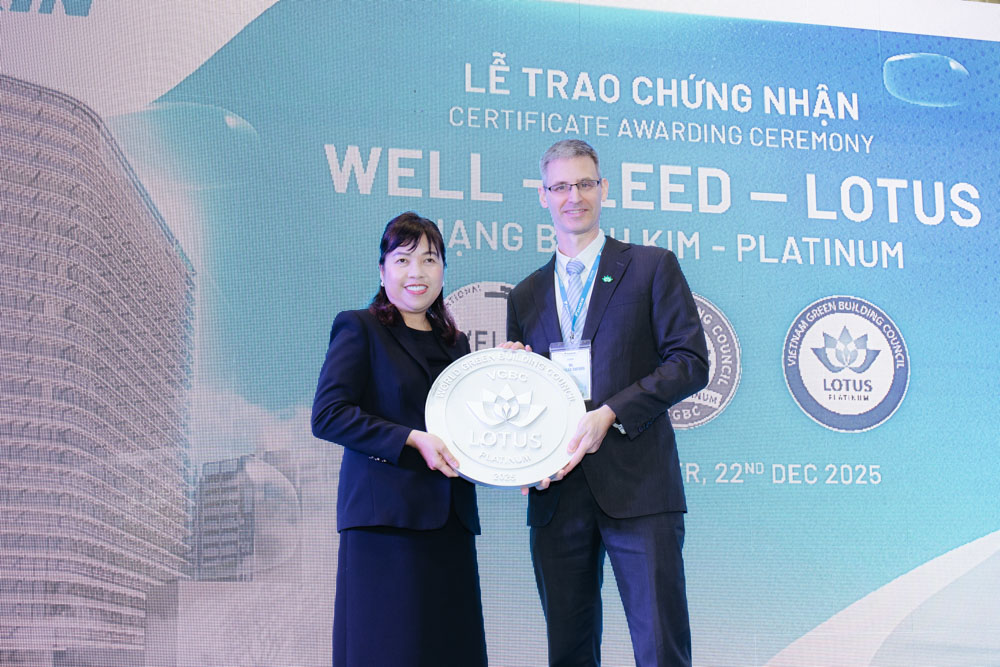 Trong khi đó, ông Douglas Snyder, Giám đốc Điều hành của Vietnam Green Building Council (VGBC), đã trao chứng nhận LOTUS Green Building Certification Platinum.