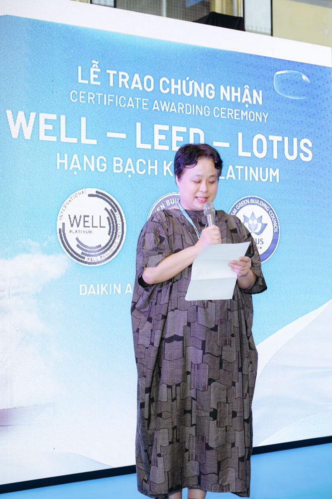 Bà Nguyễn Thị Hương Thu – Giám đốc Điều hành GreenViet – cũng công nhận rằng việc đạt chứng nhận LOTUS Platinum thể hiện sự đầu tư nghiêm túc của Daikin trong việc xây dựng một công trình thân thiện với môi trường và phù hợp với bối cảnh phát triển bền vững tại Việt Nam. Bà kỳ vọng dự án sẽ trở thành hình mẫu tiêu biểu, góp phần lan tỏa các tiêu chuẩn công trình xanh trong cộng đồng doanh nghiệp và lĩnh vực xây dựng.