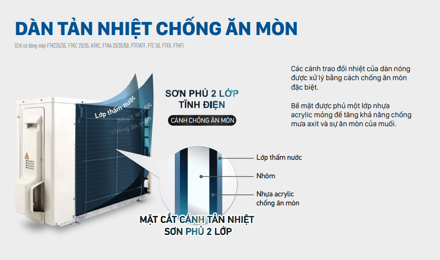 Dàn trao đổi nhiệt Microchannel: cánh tản nhiệt hợp kim nhôm + vi ống song song, tăng truyền nhiệt và giảm ăn mòn Độ bền được chứng minh qua thử nghiệm phun dung dịch muối 2.000 giờ (*áp dụng FTKY50/60/71) Dàn ống đồng cánh nhôm sơn phủ 2 lớp tĩnh điện (acrylic + thấm nước) tăng chống mưa axit và muối (*áp dụng FTKY25/35)