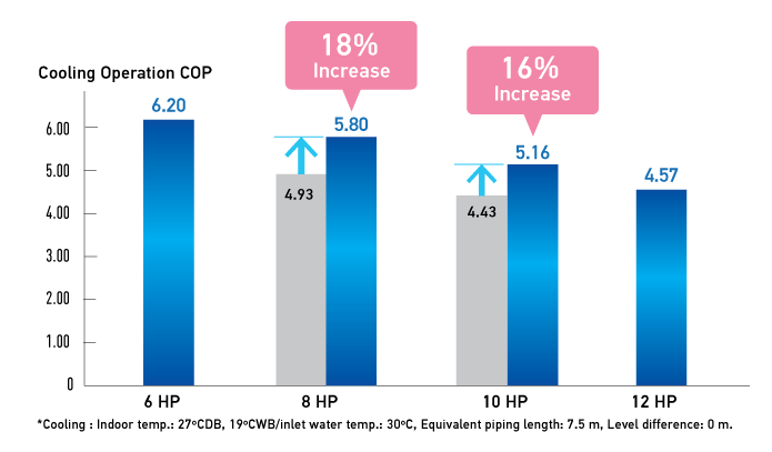 Dãy công suất rộng hơn từ 6 HP đến 36 HP. Với dãy sản phẩm được tăng cường của 2 model mới 6HP và 12HP cho dàn nóng đơn, hệ thống VRV IV W cung cấp dãy công suất mở rộng từ 6HP đến 36HP đáp ứng mọi nhu cầu.