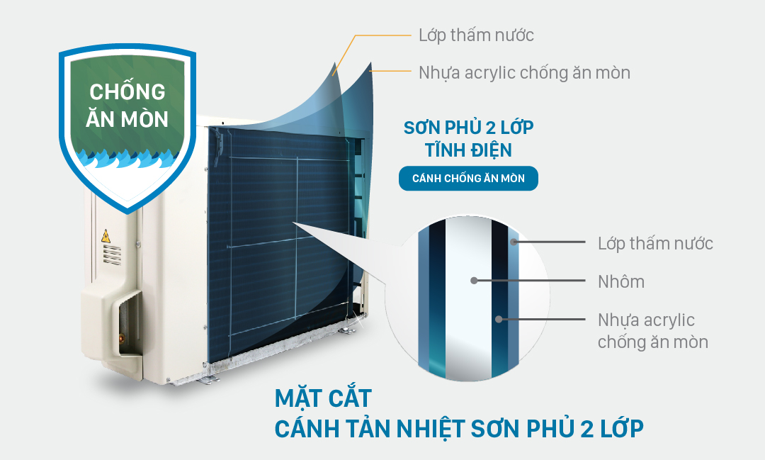 Các cánh trao đổi nhiệt của dàn nóng được xử lý bằng cách phủ lên bề mặt một lớp nhựa acrylic mỏng giúp tăng khả năng chống mưa axit và sự ăn mòn của muối. -