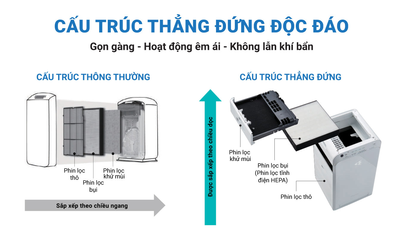 Ngoài ra, các phin lọc được xếp tầng dọc theo thân máy và phủ kín tiết diện của máy, do đó đảm bảo tất cả không khí hút vào đều được đi qua hệ thống phin và lọc sạch trước khi được thổi trả vào không gian phòng.