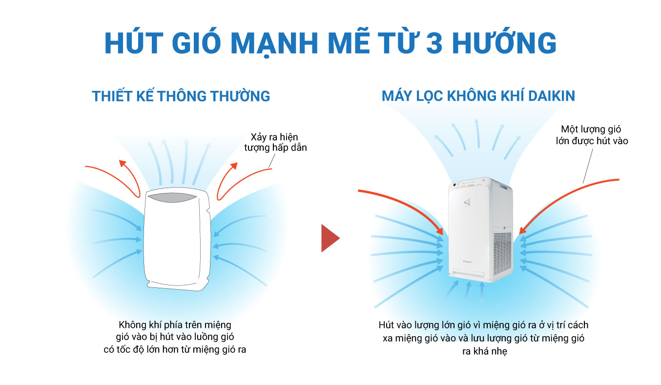 3. Không bị trộn lẫn khí bẩn vào luồng khí sạch: Thiết kế của miệng hút gió bẩn cách xa và tách biệt với miệng trả gió, giúp giảm tối thiểu lượng khí bẩn bị trộn lẫn với luồng không khí sạch thổi ra khỏi máy.