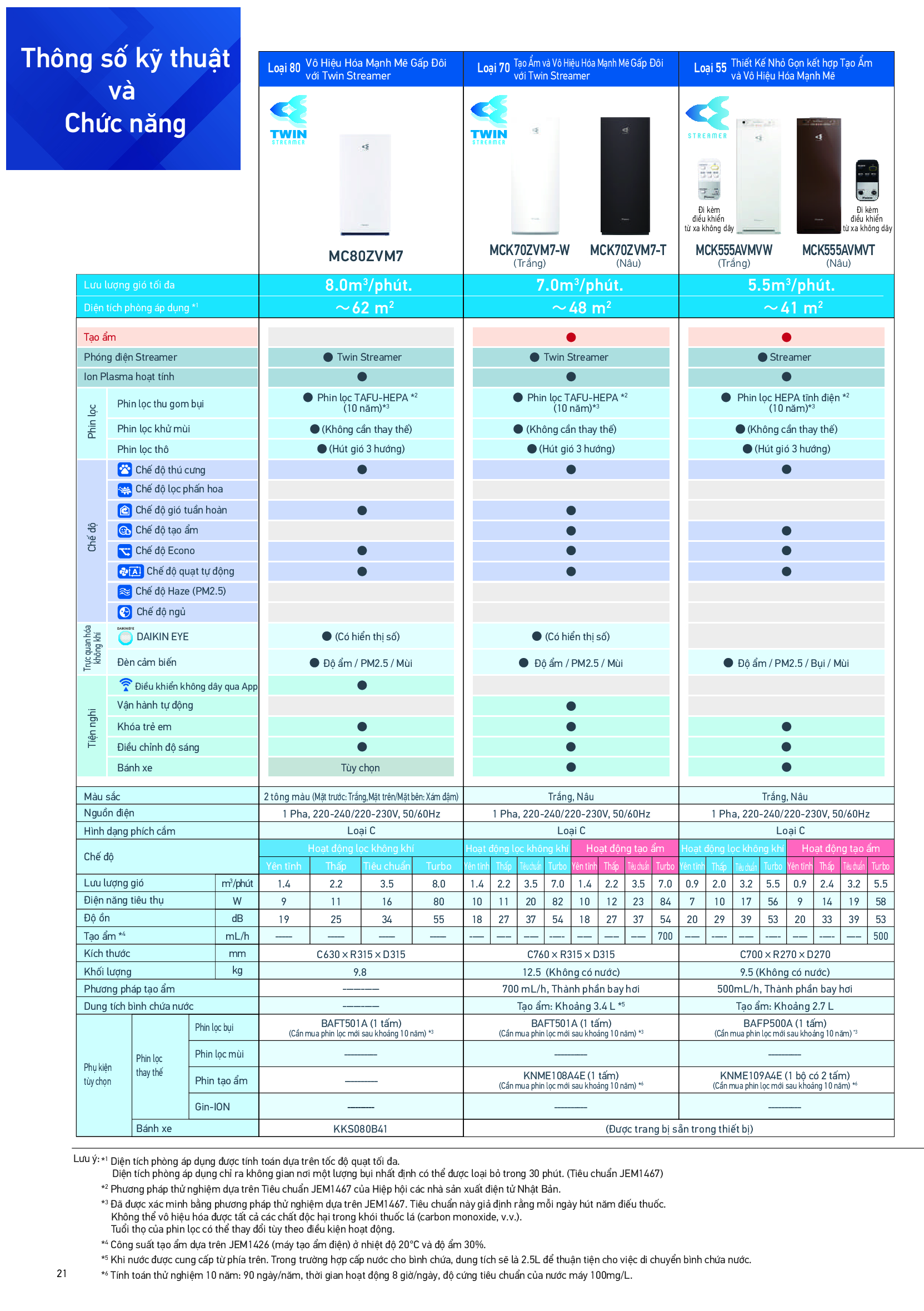 Model: MCK555AVMV-W (với điều khiển từ xa không dây) Màu sắc Trắng Chế độ Lọc không khí Tạo ẩm Diện tích áp dụng*1 Lọc không khí Lọc không khí + Tạo ẩm m2 41 (13.2m2 được lọc trong khoảng 11 phút) - 41 Nhà đúc : 23 Nhà gỗ: 14 Điện nguồn 1 Pha, 220–240/220–230V, 50/60Hz Chế độ Yên tĩnh Thấp Tiêu chuẩn Turbo Yên tĩnh Thấp Tiêu chuẩn Turbo Lưu lượng gió m3/phút 0.9 2.0 3.2 5.5 0.9 2.0 3.2 5.5 Điện năng tiêu thụ W 7 10 17 56 9 14 19 58 Độ ồn dB 20 29 39 53 20 33 39 53 Tạo ẩm*2 mL/h - - - - - - - 500 Kích thước mm H700 (700 với bánh xe) X W270 X D270 Khối lượng kg 9.5 (Không có nước) Phin lọc bụi Phin lọc tĩnh điện HEPA Phương pháp tạo ẩm Phần tử bốc hơi Dung tích bình chứa Khoảng 2.7L Phụ kiện tùy chọn Phin lọc thay thế Phin lọc bụi Phin lọc mùi Phin lọc tạo ẩm BAFP500A (1 Tấm) (Chỉ phải mua mới phin lọc sau khoảng 10 năm)*3 - KNME109A4E (1 bộ có 2 tấm) Ghi chú *1 Được tính toán bởi phương pháp thử nghiệm dựa trên Tiêu chuẩn Hiệp hội các nhà sản xuất điện nhật bản JEM1467 *2 Được xác nhận bằng phương pháp thử nghiệm dựa trên Tiêu chuẩn Hiệp hội các nhà sản xuất điện nhật bản JEM1467. Tiêu chuẩn đặt giả thuyết mỗi ngày có 5 điếu thuốc hoặc hơn được hút. Không phải tất cả các chất độc hại trong khói thuốc (Cacbon monoxit, v.v..) có thể được loại bỏ. *3 Có thể cần thay phin lọc thường xuyên hơn tùy vào điều kiện vận hành thực tế.