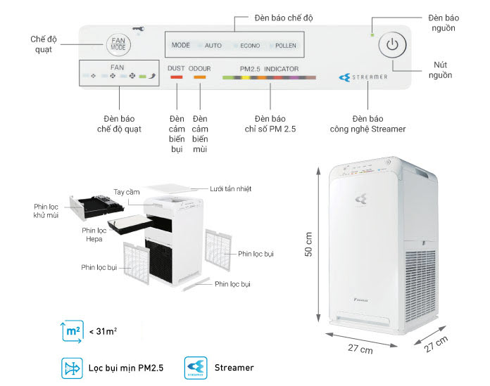 Ngoài ra, các phin lọc được xếp tầng dọc theo thân máy và phủ kín tiết diện của máy, do đó đảm bảo tất cả không khí hút vào đều được đi qua hệ thống phin và lọc sạch trước khi được thổi trả vào không gian phòng.