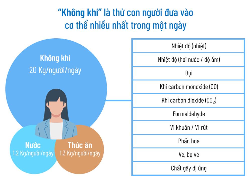 20 kg là lượng không khí mà mỗi người hít vào mỗi ngày (*). Trong khi lượng nước chúng ta tiêu thụ khoảng 1,2 kg, còn thực phẩm khoảng 1,3 kg, nghĩa là lượng không khí sử dụng hàng ngày lớn hơn rất nhiều so với thức ăn và nước uống. Biết được điều này, bạn sẽ dễ dàng hiểu rằng chất lượng không khí quan trọng không kém gì chất lượng thực phẩm và nước uống.